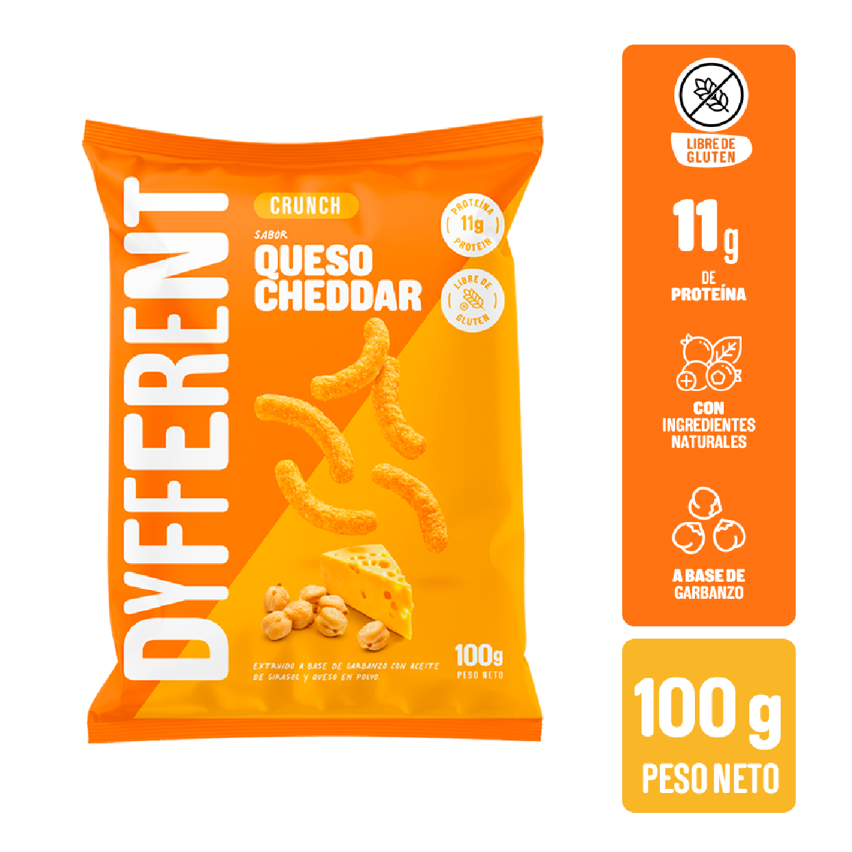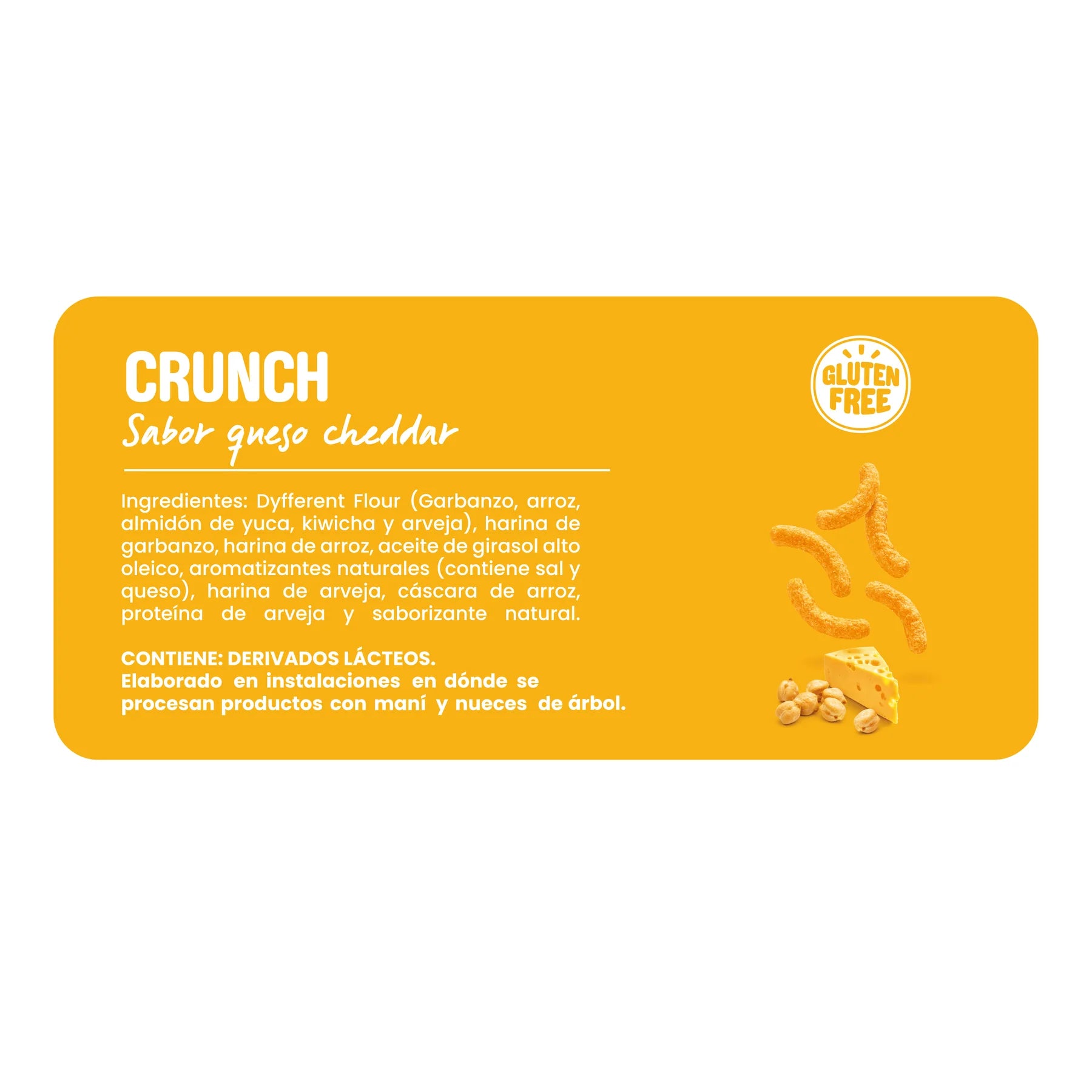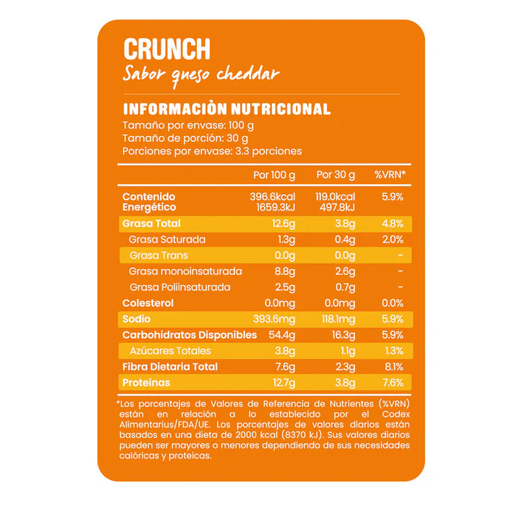 Los Crunch de Garbanzo Cheddar combinan el sabor intenso del queso con la nutrición natural de los garbanzos 🌱. Este snack está pensado para quienes quieren una alternativa más nutritiva, con proteína y fibra reales, sin gluten y sin sabores artificiales.